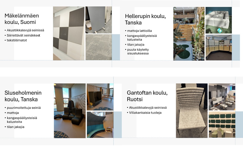 Näissä kaikissa neljässä koulussa oli käytetty akustiikkaa parantavia sisustus- tai kalusteratkaisuja ja pääosin tilat vaikuttivat kaiuttomilta myös ns. läpikulkutiloissa. Tilojen läpinäkyvyys ja orientoituvuus tilasta toiseen toteutui joko tilojen avoimilla ratkaisuilla (Hellerupin, Sluseholmenin ja Gantoftan koulut) tai lasiseinillä (Mäkelänmäen koulu). Ympäristön häikäisemättömyys ja rauhallisuus ei kuitenkaan toteutunut kaikissa kouluissa. Tavaraa ja kalusteita saattoi olla tilassa paljon ja vain osassa kouluista oli ikkunoiden häikäisyä pyritty estämään esim. verhoilla tai sälekaihtimilla. Sluseholmenin koulussa oli koko seinän korkuisia suuria ikkunoita ilman häikäisyn suojaa. Äänen vahvistusta parantavasta tekniikasta ei ollut havaintoa tiloissa mutta tiettävästi Mäkelänmäen koulussa induktiosilmukka tai vastaava on.