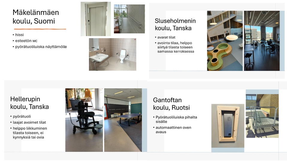 Näistä kouluista löytyi hissejä, pyörätuoliluiskia sekä liikkumisesteisille tarkoitettu wc–tila (Mäkelänmäen koulu). Kolme koulua neljästä oli monikerroksisia, joten ilman hissiä ei liikkumisesteinen pääsisikään kaikkiin kerroksiin. Vaikka tekstiilimatto vaimentaa hyvin ääntä ja on siten akustisesti toimiva ratkaisu, se voi myös hankaloittaa pyörätuolilla liikkumista. Suuret avoimet tilaratkaisut ilman kynnyksiä tai ovien avaamista helpottaa myös liikkumisesteisten siirtymistä tilasta toiseen (Sluseholmenin ja Hellerupin koulut).