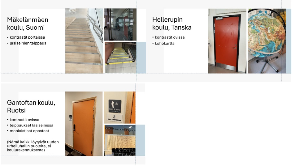 Sluseholmenin koulussa ei ollut havaittavia tekijöitä, jotka tukisivat näkemistä. Muissa kolmessa koulussa oli huolehdittu kontrasteista joko ovissa tai rappusissa. Hellerupin ja Gantoftan kouluissa ei ollut kontrasteja rappusissa tai kulkuväylillä. Muutoinkin näkemiseen liittyvät tekijät olivat vähäisiä. Kahdessa koulussa oli lasiseiniin laitettu myös teippauksia, jotta ne erottuisivat ympäristöstä. Gantoftan koulussa oli huomioitu moniaistiset opasteet, mutta niitäkin löytyi vain uudesta urheiluhallista eikä koulun tiloista. Kohokartta Hellerupin koulussa auttaa sekä näkövammaisia että hahmotushäiriöisiä.