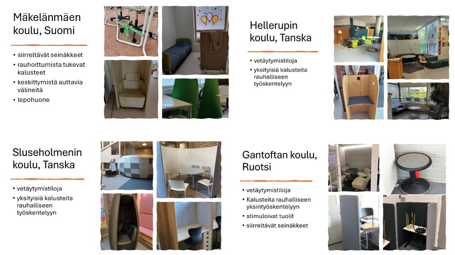 Gantoftan koulussa oli joitakin yksittäisiä stimuloivia tuoleja, mutta niitä sai käyttää vuoroperiaatteella kuka kulloinkin halusi. Sluseholmenin koulussa oli erilaisia yksintyöskentelyyn sopivia kalusteita sekä ryhmätyöskentelyyn sopivia kalusteita. Mäkelänmäen koulusta löytyi jokaisesta ”kylästä” ja useimmista luokkatiloista siirreltäviä seinäkkeitä, rauhalliseen työskentelyyn tarkoitettuja kalusteita, keinuja sekä erilaisia apuvälineitä keskittymiseen esim. kuminauhoja pöydän jalkoihin, ilmatyynyjä ja painoleluja. Jokaisesta vuosiluokkakohtaisesta kylästä löytyy myös ikkunaton rauhoittumistila sekä vaativan erityisopetuksen tiloista lepohuone. Mahdollisuutta ruokailuun rauhallisessa tilassa jäi epäselväksi muutoin kuin Mäkelänmäen koulussa, josta tällainen tila löytyy.