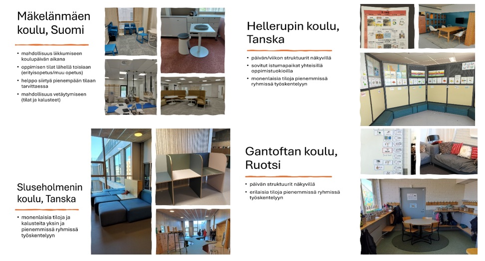Yhdessä oppimista ja osallisuutta tuki näissä kouluissa muunneltavat tilat ja kalusteet, joihin oli mahdollisuus siirtyä koulupäivän aikana omaan rauhaan tai pienempään ryhmään. Mäkelänmäen koulussa oli lisäksi jokaisessa vuosiluokkakohtaisessa kylässä erityinen tila, jossa oli erilaisia liikuntavälineitä. Hellerupin koulun toimintakulttuuri perustui yhdessä oppimiseen, joten tukea tarvitsevat opiskelivat muiden mukana samoissa ryhmissä. Luokkatiloissa oli usein käytetty struktuureja, jotka helpottavat monien oppilaiden työskentelyä. Vaikka Gantoftan koulutilat olivat ns. perinteisiä käytäväkouluja, oli sinnekin pystytty tekemään erillisiä pienryhmätiloja esim. naulakkotilaan tai sohvaryhmiä erilliseen huoneeseen. Inklusiivista toimintakulttuuria kuvastaa se, että Gantoftassa esim. maahanmuuttajataustaiset oppilaat istuvat kahden paikallisen oppilaan välissä ja he saavat siten vertaistukea kielen oppimiseen.